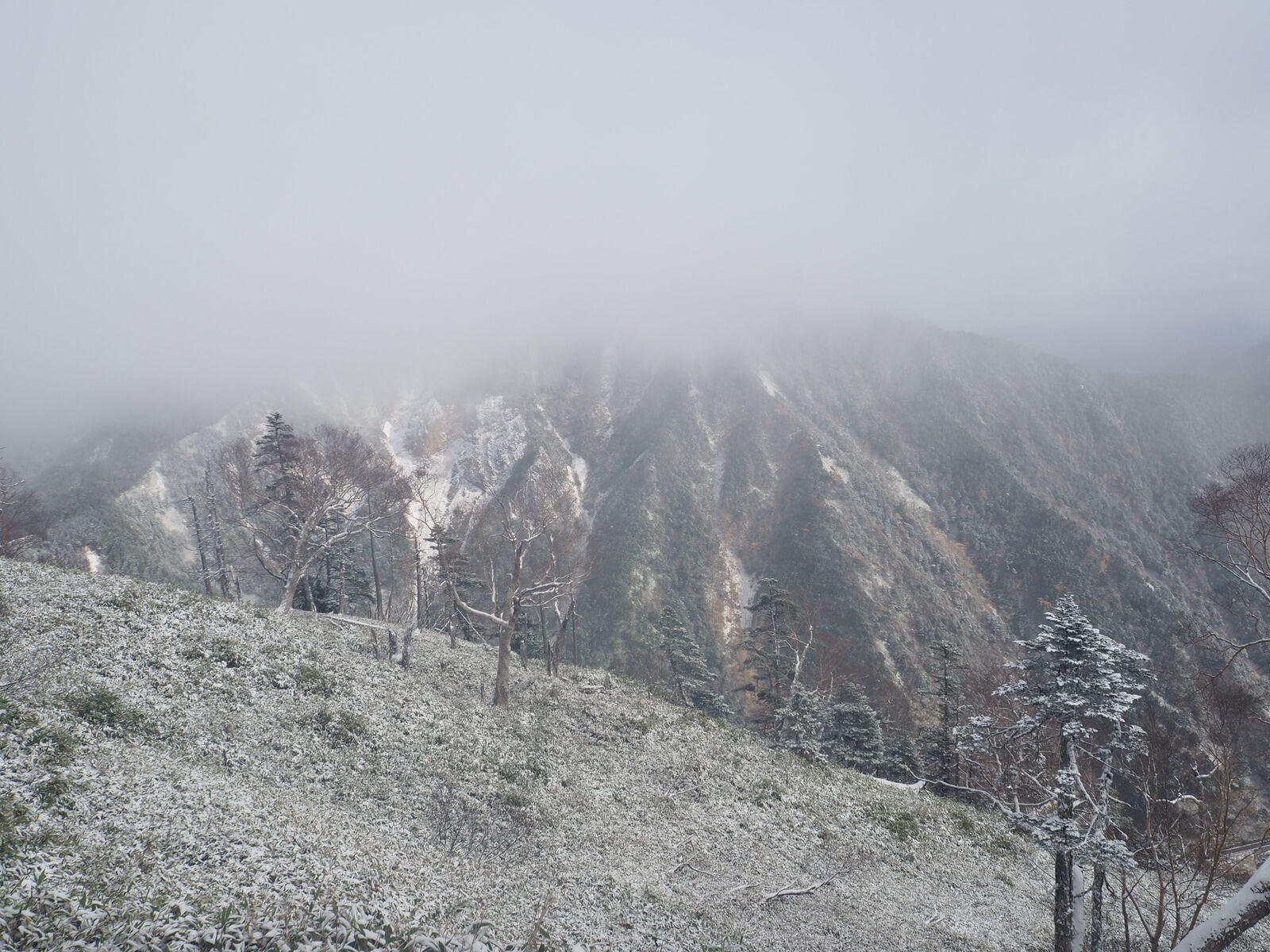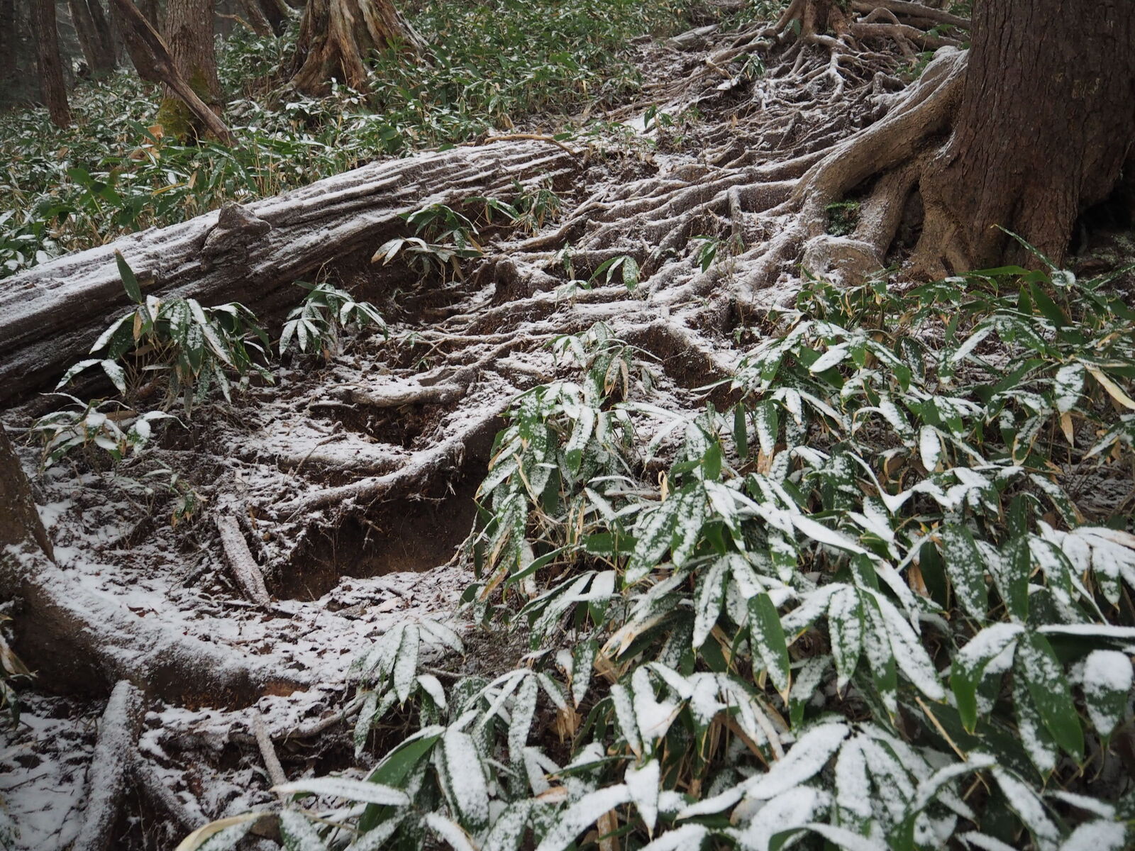 なんとか熊笹ゾーンを抜けると全身ビッショリで寒い所に急斜面ゾーン出現