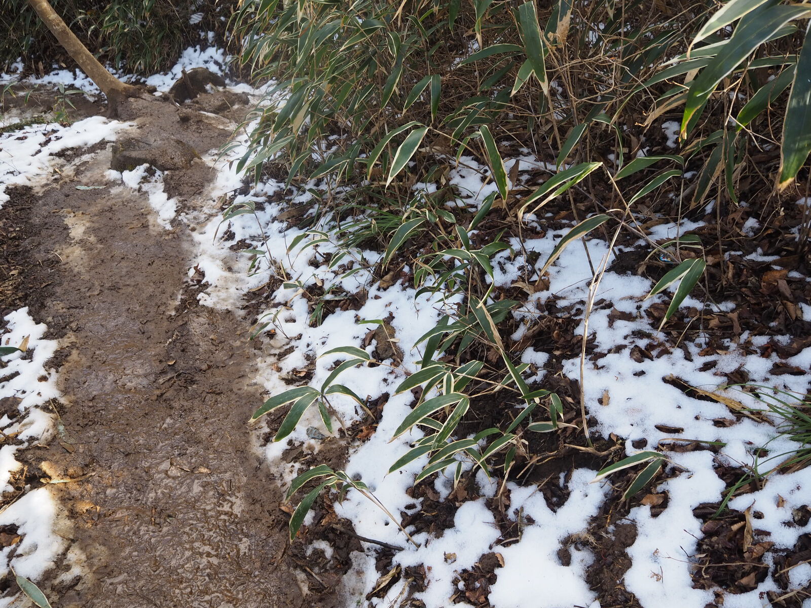 上部は残雪で滑って怖いし、途中からはドロドロで滑って怖いです